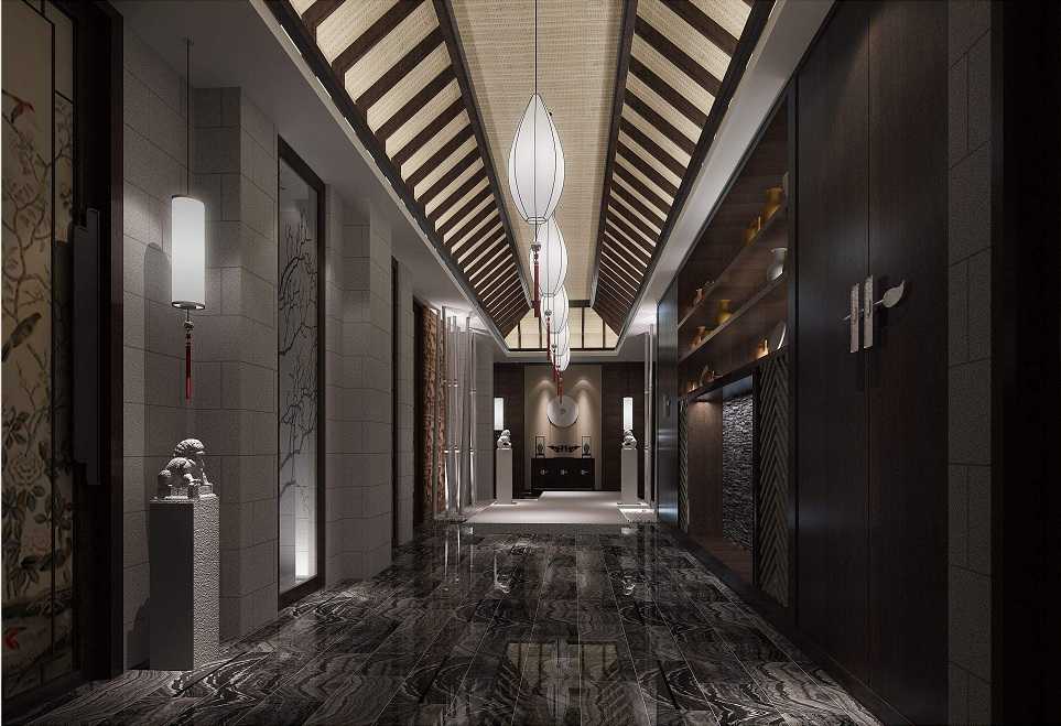在中式酒店客廳的客廳設計上采用現代的裝飾手法和家具,結合古典中式的裝飾元素,來呈現亦古亦今的空間氛圍。