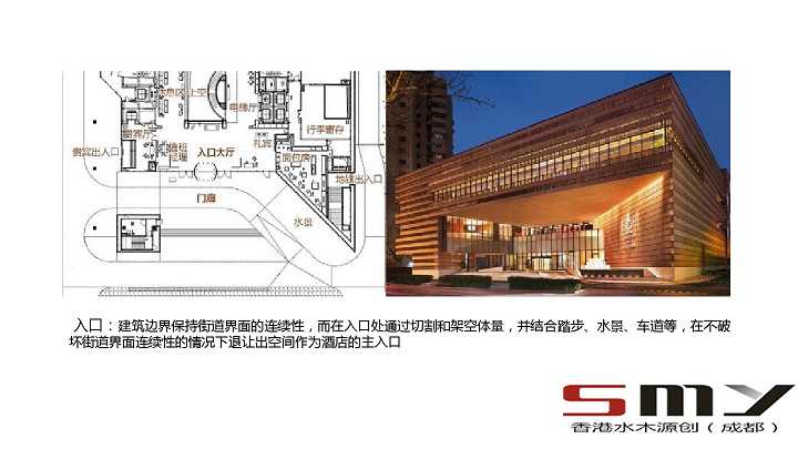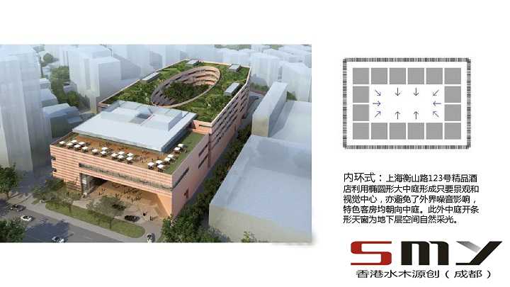 酒店分為餐飲區(qū),會議區(qū)和以內(nèi)庭院為核心的客房區(qū)。客房沿著花園室內(nèi)庭院布置,采用點式布局,使百分之七十的客房面朝花園內(nèi)庭院。為了達到理想的效果,外立面采用了由意大利進口的紅色陶板,這樣即加強了形體的幾何感,又與之相鄰的也是以赤陶磚作為飾物的原上海美國國際學(xué)校的建筑外墻交相呼應(yīng)相得益彰。