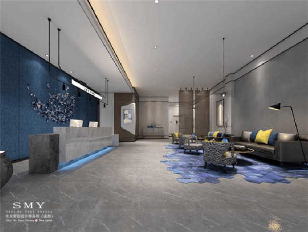 本案設計師打造的一家簡約風的商務酒店,設計師在酒店設計時經過嚴格考察,精心的將新中式簡約風設計成簡約而不簡單的酒店風格,如湖水天空一般的藍色與溫暖明亮的亮黃色組合在一起時碰撞出一種親切中帶有一絲高冷、柔和中帶有一絲堅強,將憂郁的藍色與溫暖的黃色搭配使用正是巧妙運用了冷色調與暖色調調和而出的一種色彩的跳躍,不會讓二種顏色搭得很牽強。