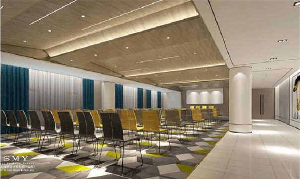 酒店配置多功能廳,能容納100人會議,多功能商務廳設計也很時尚,座椅彩用兩色交替,讓整個會議多姿多彩,整個大廳色彩與酒店設計主色統一,藍色窗簾遮光性好,廳頂采用簡約的燈光設計,保證足夠亮度的同時有減輕了廳頂的稱重能力。