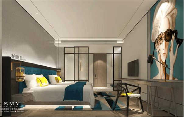 本案商務酒店設計了五種房型:大床房、大床房暗房、標準間、圓床房以及總統套房。五種房型的設計都很簡約,藍色與黃色使用的相得益彰,在加上墻上的一幅畫讓整個房間都不顯單調,使房間設計更加時尚。