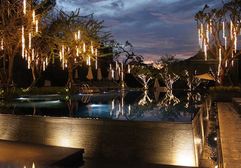 那么,生態度假酒店應當如何營造一處城市所不具有的自然景觀體驗空間?其關鍵之處,便在于如何將客戶視線從酒店本身延伸到酒店外部環境,并依托景觀設計方法將周邊環境與資源引入酒店,進而形成酒店的個性。生態度假酒店景觀設計的核心與重點便在于外部環境的規劃與設計上,在設計時,應該對場地及周邊環境進行了全方位的勘察與調研,將當地的自然生態系統以及之下的各種自然資源進行分析、整合和主題性規劃。所以,因山就勢,借水成景,根據場地條件所設計的項目的山水骨架,不僅遵循著設計結合自然的新山水設計法則,更是借此形成了度假酒店的獨特生態景觀特色。