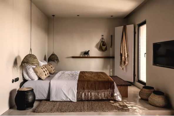 酒店的客房設計力求表達地中海建筑的古樸與純粹之美,手工打磨后的墻面、藤制的燈具及物件、柔軟的床品等等,都只是為了呈現自然界美好的一面。