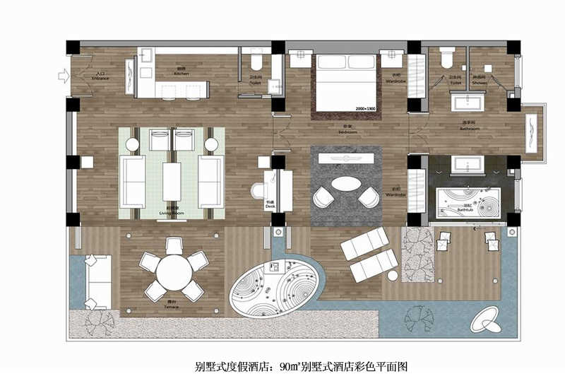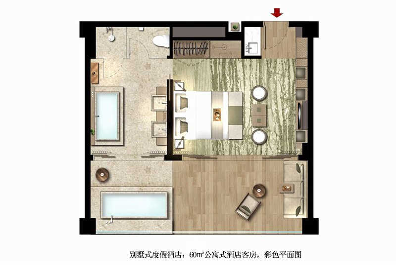 別墅式酒店有兩個戶型,一種是60平方米的別墅式酒店戶型,另一種是90平方米的別墅式酒店戶型。