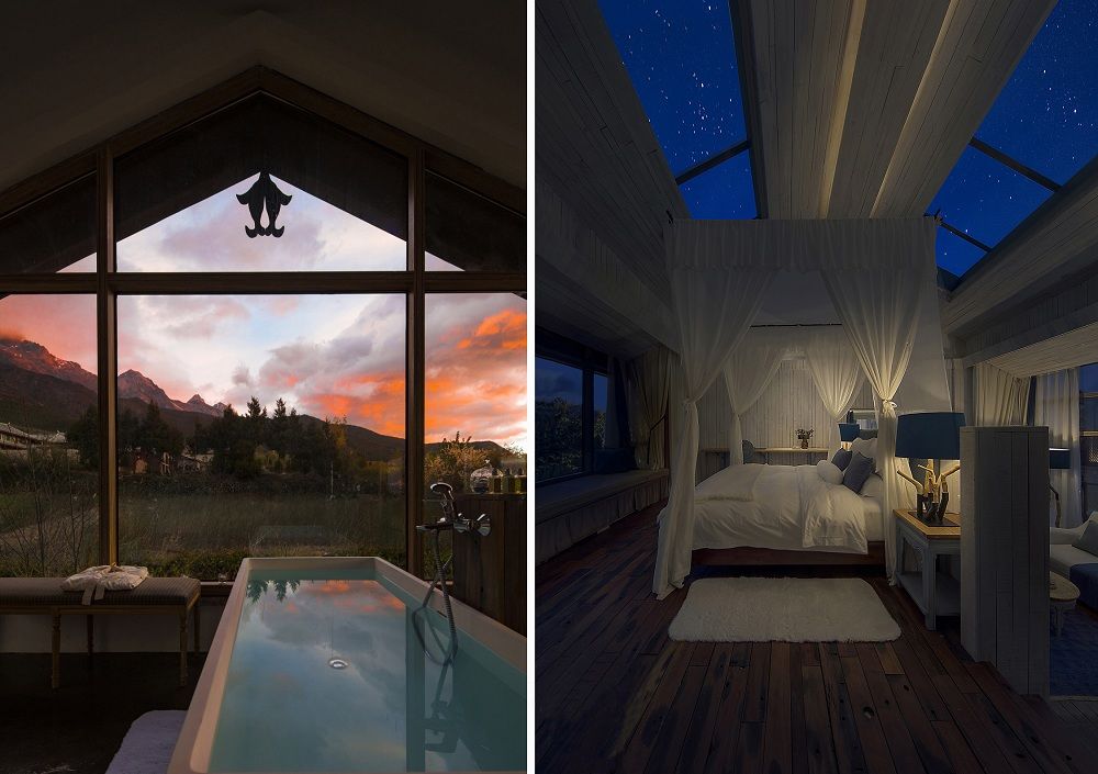 坐在室內拿開窗簾一幅絕美長篇的畫卷盡收眼底,幾乎每個房間窗外都被田野、雪山和森林包圍。房子四面開窗,更大限度使用自然光、自然風,節(jié)省能源。屋頂有自動天窗,躺在床上就可以欣賞玉龍雪山的美景與夜晚的滿天繁星。幾乎360度任何一個角度都不能被浪費,每每都是幽景。